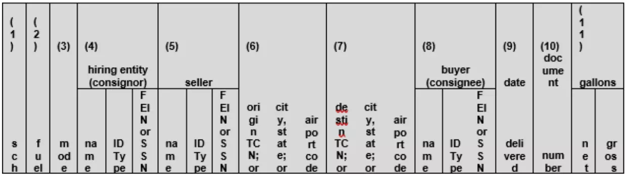 This will include all imports, exports, and in-state transactions for the period. Each record should contain a Schedule (1A, 2A, or 3A), Fuel Type, Hiring Entity Name, Hiring Entity ID Type, Hiring Entity ID, Seller Name, Seller ID Type, Seller ID, Transportation Mode, Origin Terminal or City, State, Destination Terminal or City, State, Buyer Name, Buyer ID Type, Buyer ID, Date Received, Doc Number, Net Gallons, Gross Gallons.